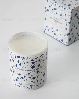 Ароматическая свеча Mediterrane помещена в стакан цилиндрической формы. Синие «камни», разбросанные на белоснежном фоне, выглядят ярко и необычно, сразу привлекая к себе внимание.
