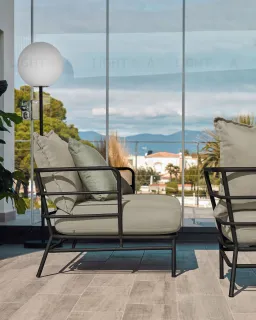 Кресло Mareluz – это ультрасовременный и минималистичный стиль, который наверняка оценят поклонники прогрессивных дизайнов. Здесь сталь задает тон всему изделию, показательно сковывая массивные подушки. Такая модель отлично подойдет для современных уличных или домашних интерьеров, станет отличным местом для отдыха.