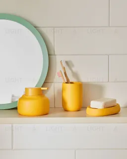 Коллекция Chia состоит из трех предметов – дозатора для мыла, стакана для зубных щеток, мыльницы. Цвет изделий – ярко-желтый и розовый.
