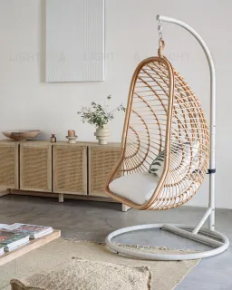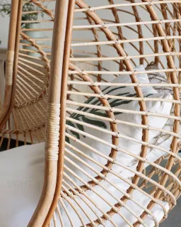 Подвесное кресло сплетено вручную из ротанга и веревки бежевого цвета. Оно цельное и не требует сборки. Веревка из полиэстера. Она прочная и износостойкая, не выгорает на солнце, не портится от влаги. Диаметр каркасной трубы – 3 см.