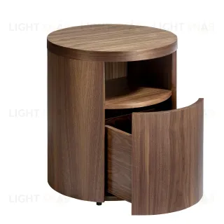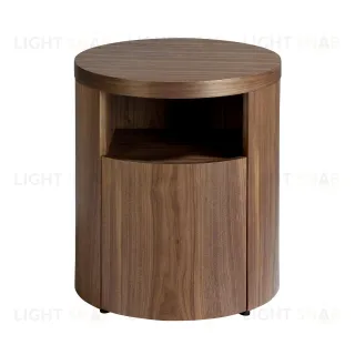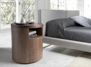 Данная прикроватная тумбочка имеет цилиндрическую форму. Вверху предусмотрена открытая полка, а ниже — ящик, дверца которого едва заметна. Она не имеет ручек, а открывается путем нажатия. Ящик оснащен доводчиком и прочными металлическим направляющими, обеспечивающими долгую эксплуатацию.