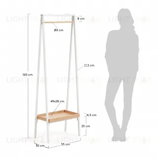 Вешалка полностью деревянная. Она состоит из четырех опор, перекладин, штанги и полки для обуви.